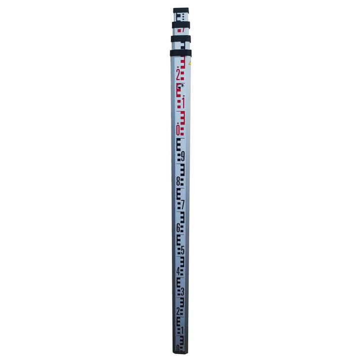 شاخص بارکد 5 متری دو رو مدرج جنس آلومینیوم کیفیت ساخت بالا حالت باز شونده کشویی مخصوص ترازیابی های دقیق تا دقت > 2 میلیمتر دارای تراز کروی و قفل